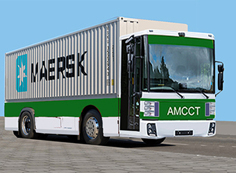 Distribution vehicles adapted to unit loads and are electrically driven. Here a vehicle that handles 20 foot ISO containers.