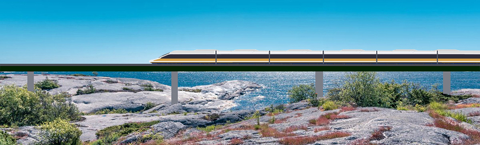 AMCCT AB has presented a completely new way of building high-speed tracks and at greatly reduced prices and significantly faster construction times. By building the high-speed tracks in steel and in standardized modules, both costs and construction times can be cut significantly. We can say that we build for 65-75% of the presented construction estimate and we can build out the whole of Sweden within 5-7 years. The enormously short construction time has great significance for the costs of implementing an expansion of the high-speed trains. In the planned land-based alternatives, construction times are 3 times as long. At significantly higher costs.