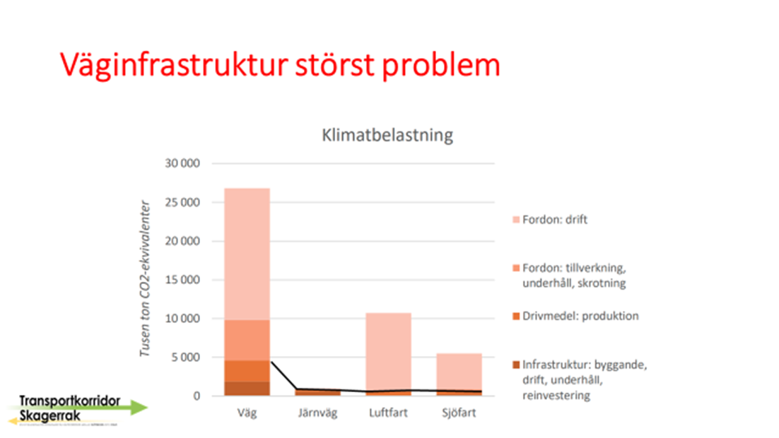 Det som man kan läsa mellan raderna är att den nya regeringenvill skapa förutsättningar att helt avveckla järnvägstransportrna. Man drar ned pengarna för järnvägssidan men ökar pengarna för fordonssidan på väg. Trots att detta är den sämsta investeringen som man kan göra. Återigen framträder FFI:s påverkan på vår infrastruktur. Av nedanstående figur visar klart att vägtrafiken är det största problemet inför framtiden.