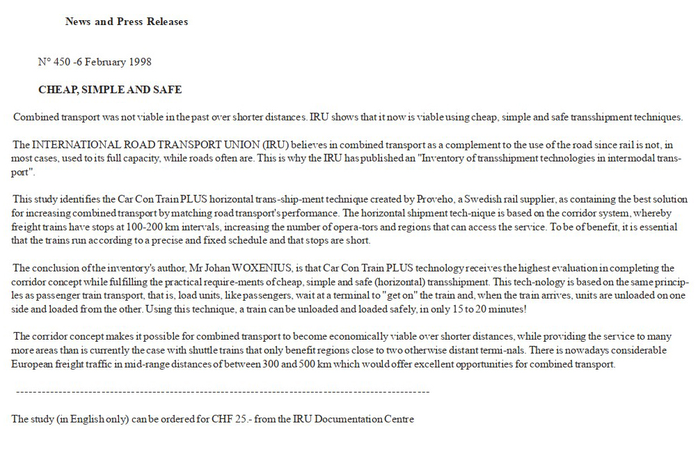 The NEA unanimously decided that the CarConTrain (CCT) system was the most suitable system to form the basis for the development of the future intermodal transport structure. They issued a press release from the IRU about the future development. You can see what the IRU sent out based on the NEA report in the images below. It was of course too much for the truck industry.