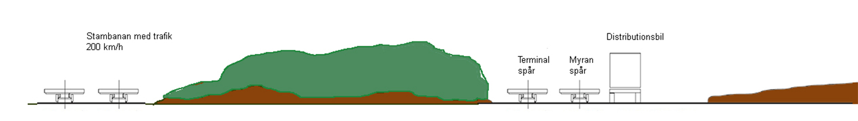 The terminals shall be simple terminals and where unit loads are handled automatically by "Myran". The terminals shall be electrified to quickly enter the terminal and quickly exit again. No shunting of wagons. Interconnected train sets. The wagons are adapted to CCT Technology and are equipped for that handling. The wagons are built for 200 km/h and a minimum of 160 km/h